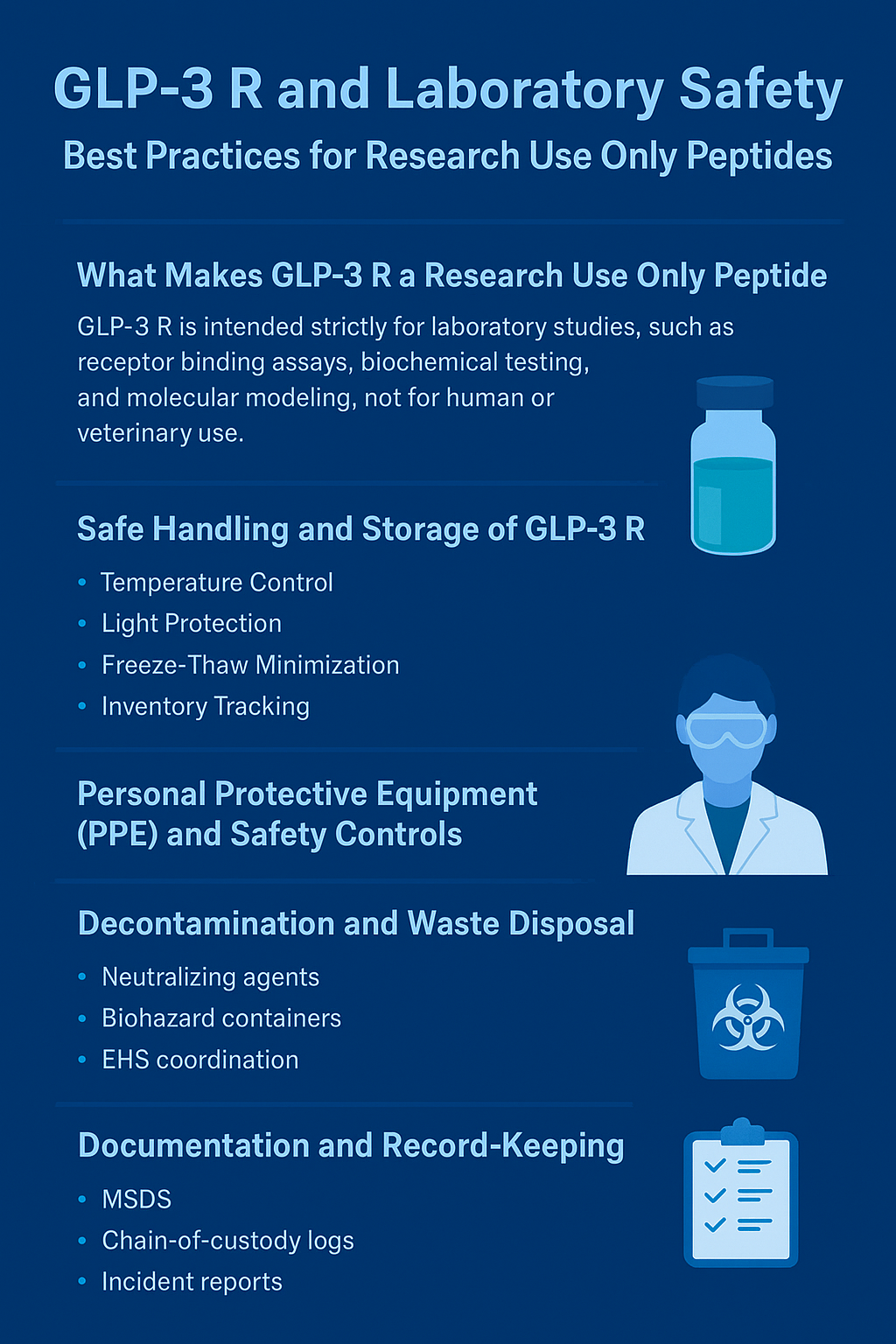 GLP-3 R research contributes valuable insights to peptide science—but only when handled under the highest safety and compliance standards. Following best practices for PPE, storage, documentation, and disposal ensures both the validity of experimental results and the well-being of laboratory personnel.